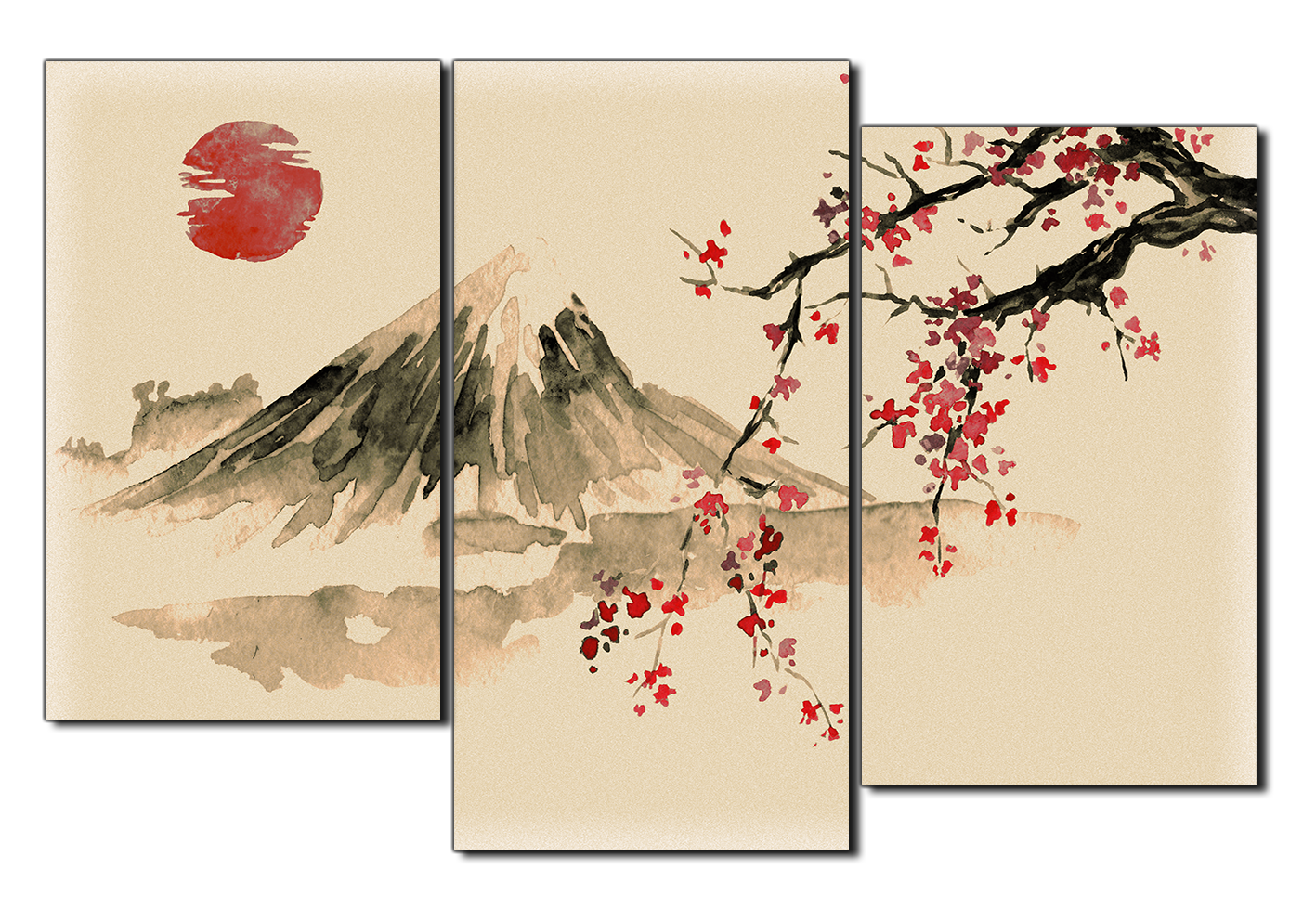 Obraz na plátně - Tradiční sumi-e obraz: sakura, slunce a hory