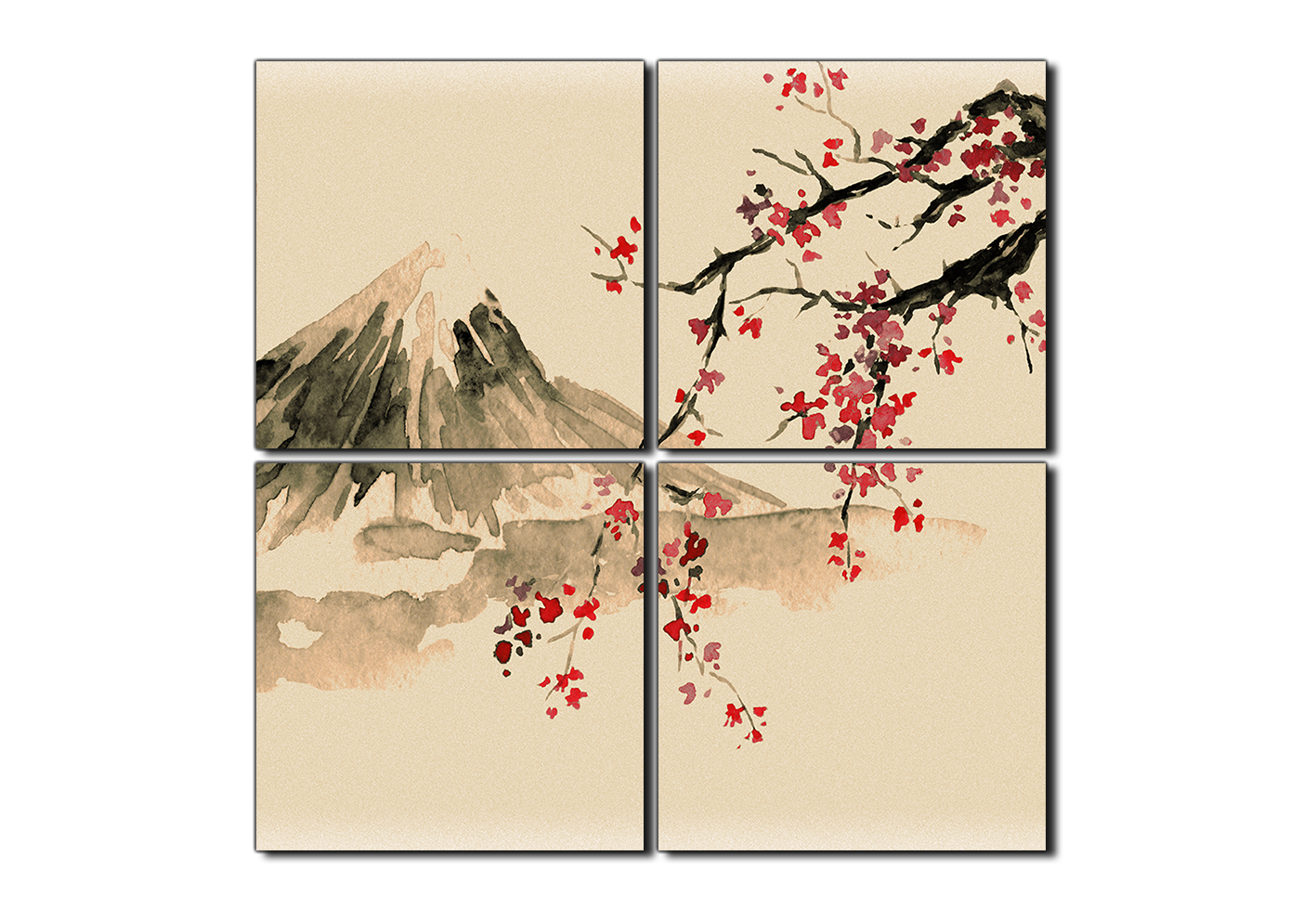 Obraz na plátně - Tradiční sumi-e obraz: sakura, slunce a hory - čtverec