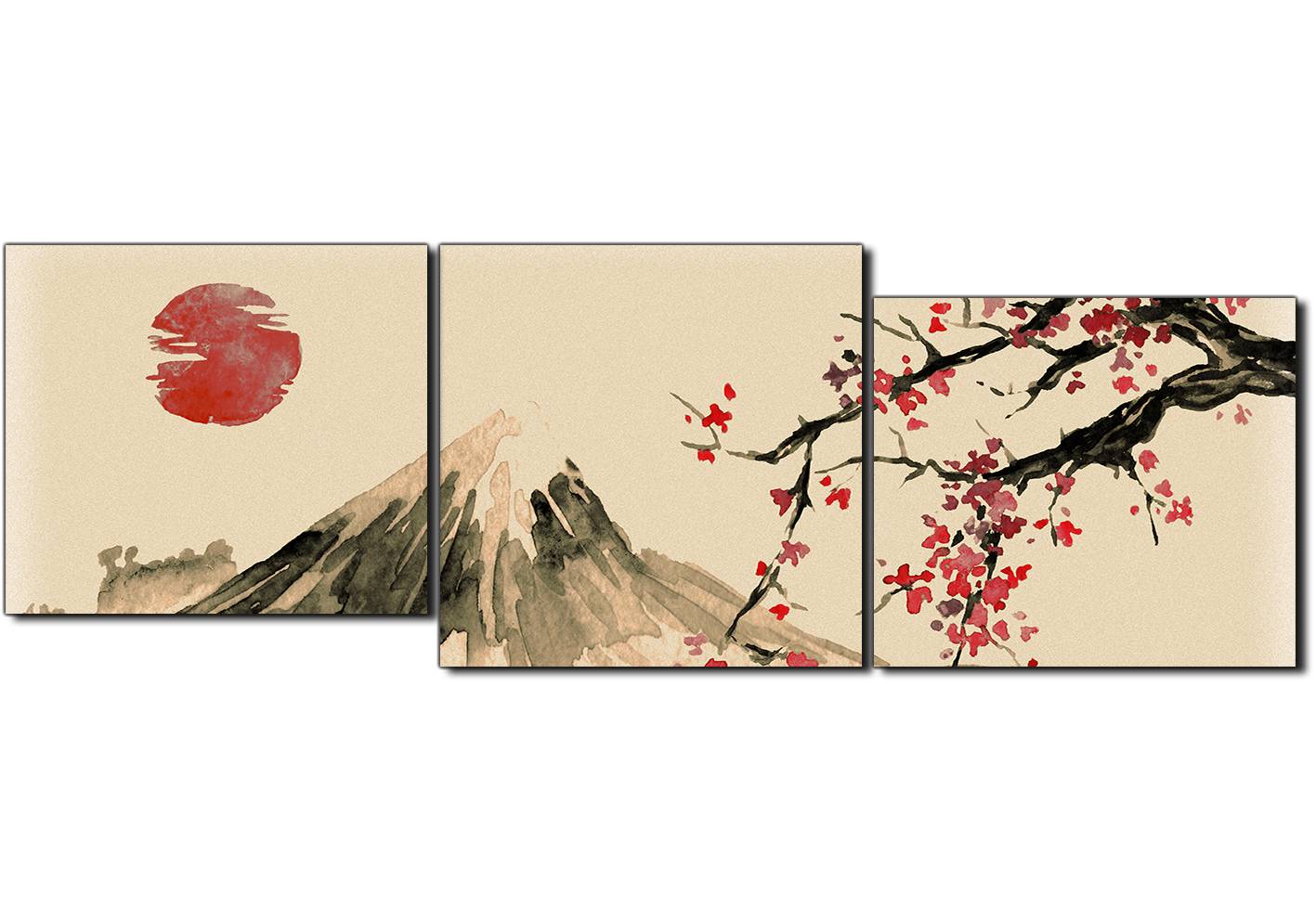 Obraz na plátně - Tradiční sumi-e obraz: sakura, slunce a hory - panoráma
