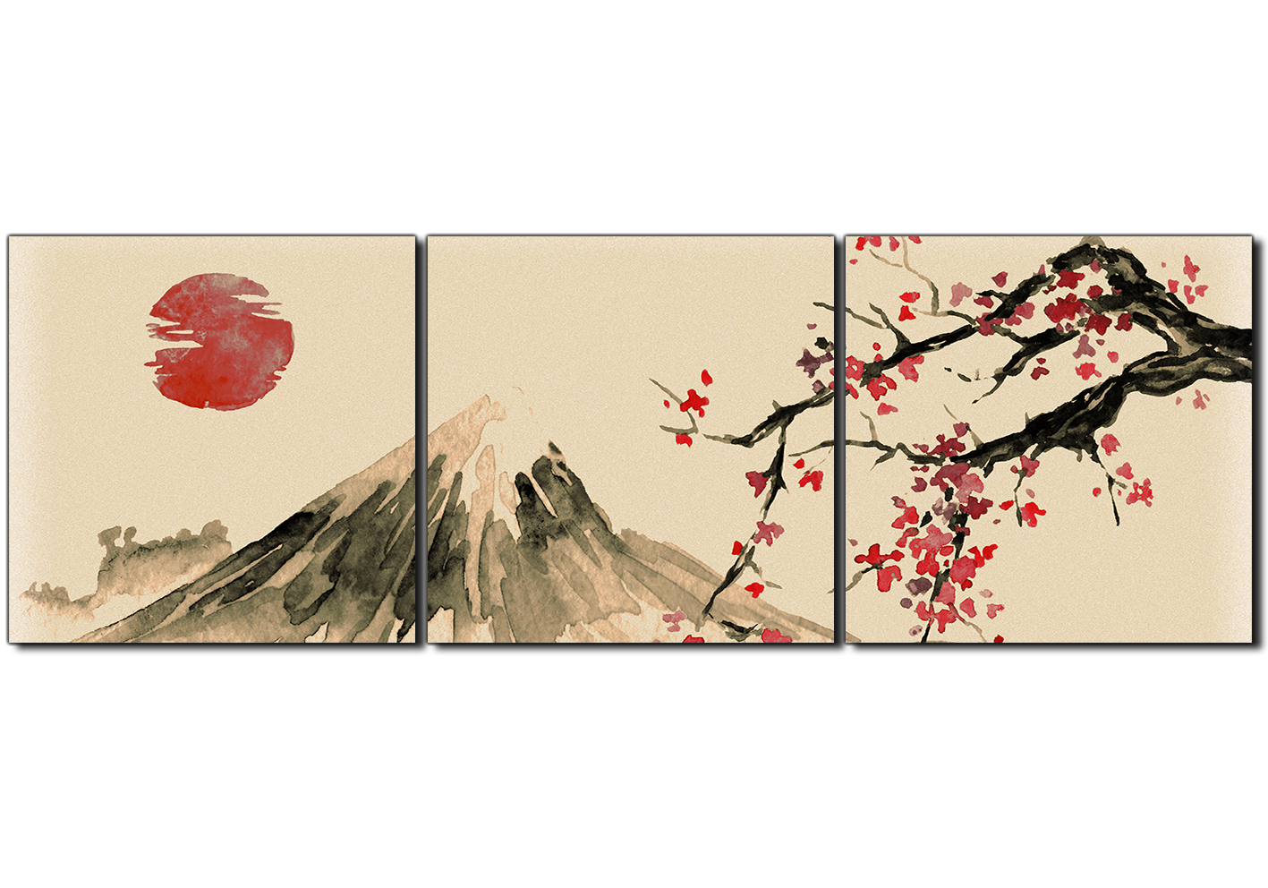 Obraz na plátně - Tradiční sumi-e obraz: sakura, slunce a hory - panoráma